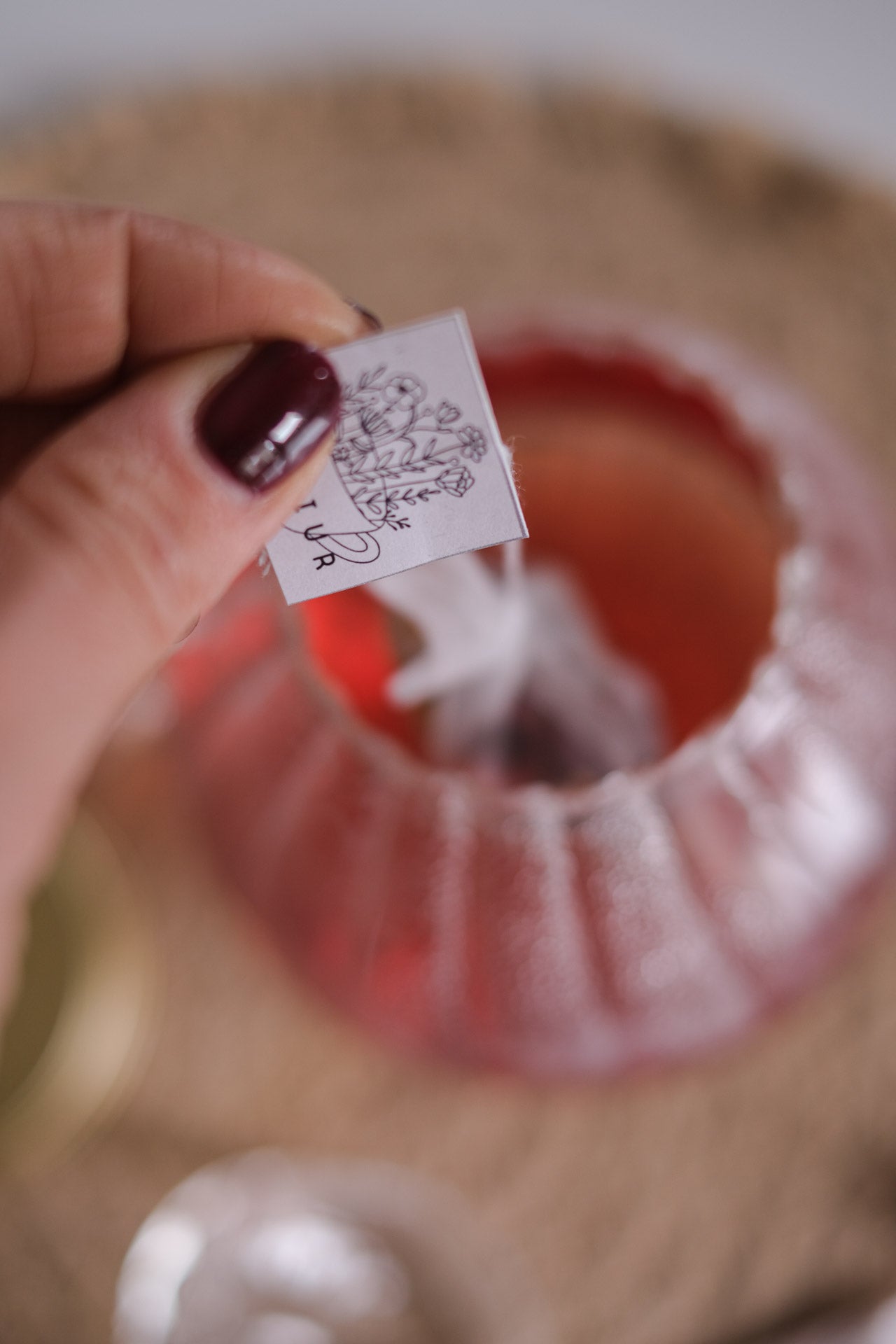 Un filtro avvolto in un sacchettino di organza per una tazza di relax.