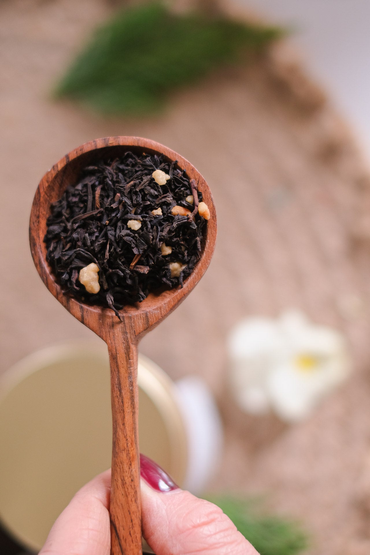 Ingredienti: tè nero, pezzetti di croccante (zucchero, nocciole), granella di cacao, aroma, pezzetti di vaniglia.