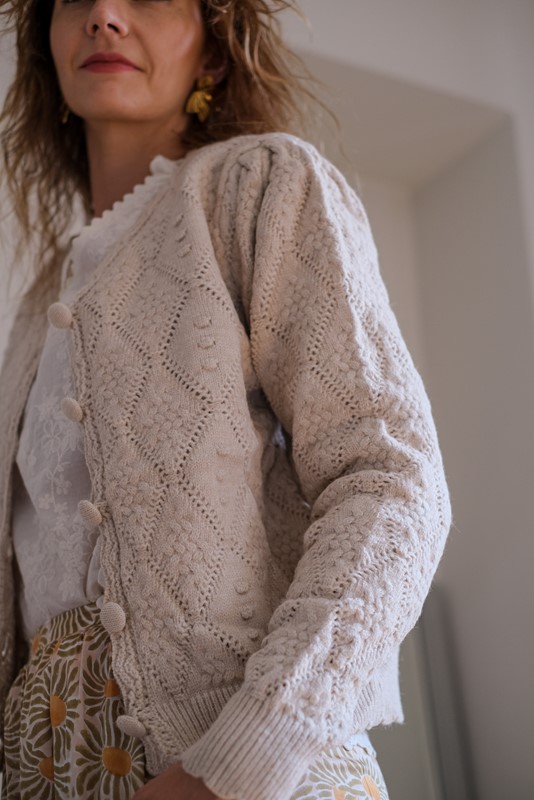 Il colore di una notte nel deserto. Indossalo aperto per un effetto più boho. Composizione: Acrilico : 60%, Viscosa : 20%, Lana : 15%, Elastan : 5% Taglia unica (veste da una tg40 a una tg46)