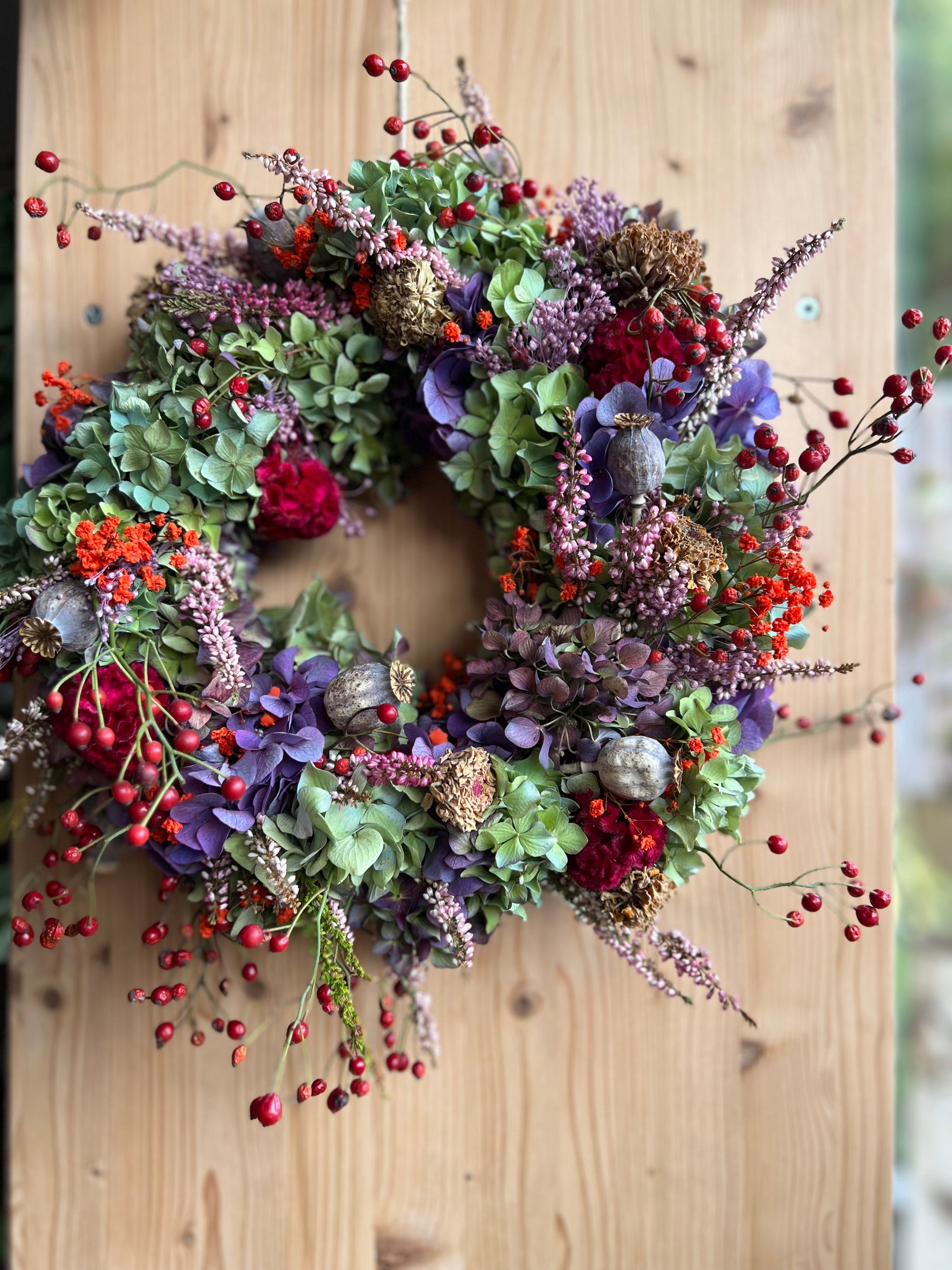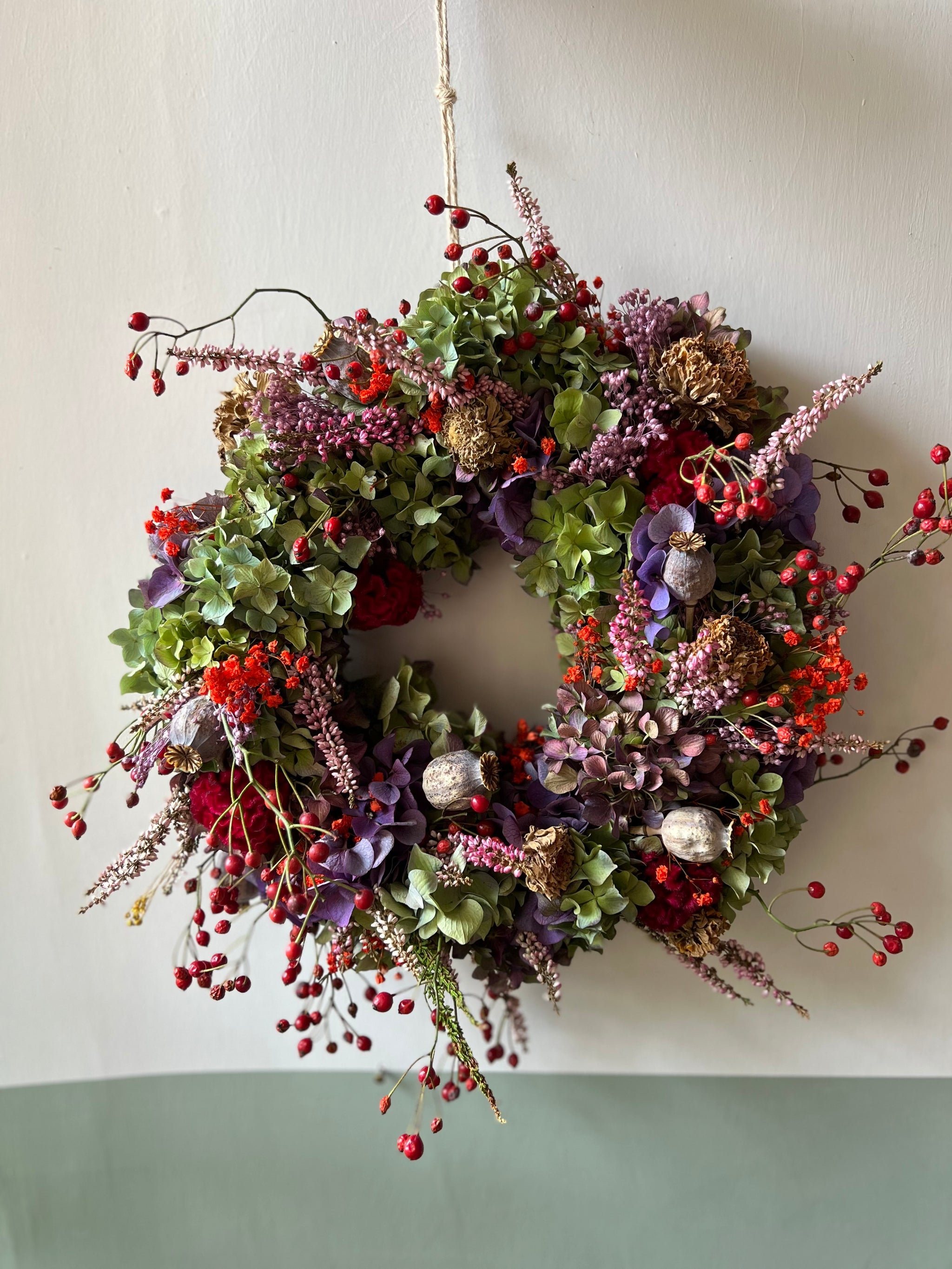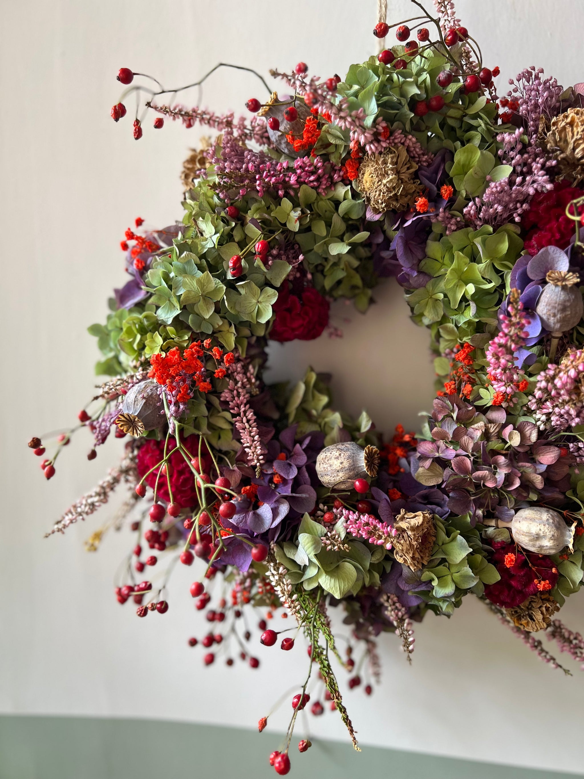 Ghirlanda fatta a mano realizzata su una base in paglia con fiori freschi e secchi. DIAMETRO: 35cm circa.